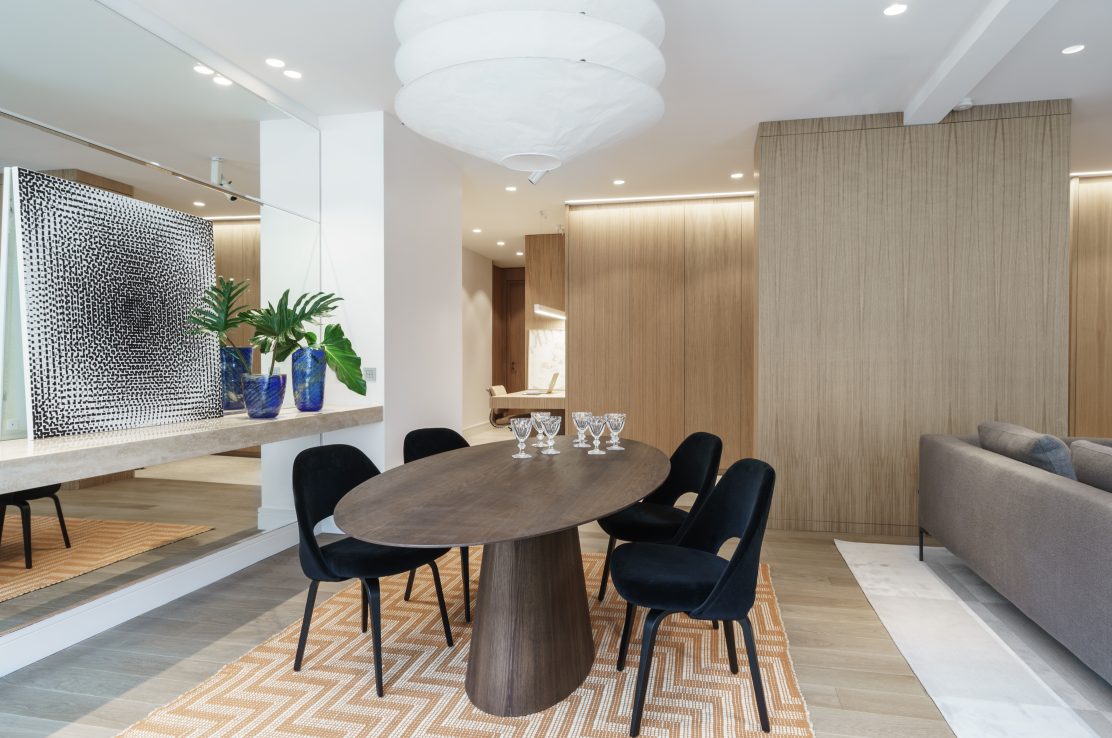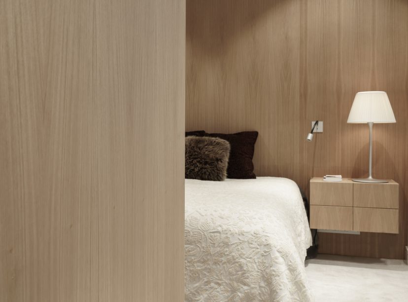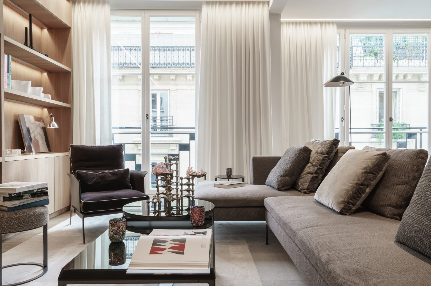 Un appartement entièrement retravaillé pour offrir un pied-à-terre parisien à nos clients. Le bois et la pierre se répondent dans toutes les pièces, les murs sont habillés, les matières nobles dessinent des lignes épurées.