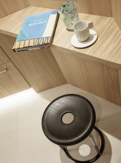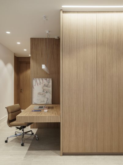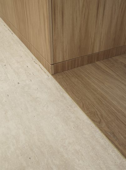 Des placages naturels toute hauteur encadrent l'espace home-office avec son bureau suspendu, au sol, du travertin non rebouché contraste avec le parquet chêne qu'on retrouve dans l'espace de vie