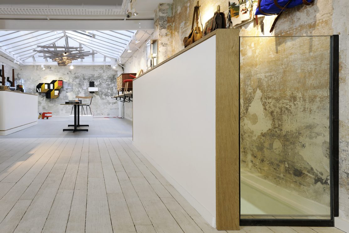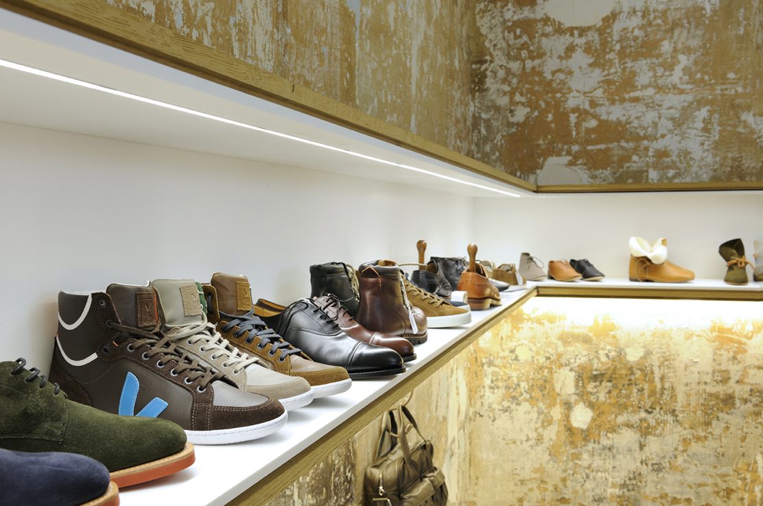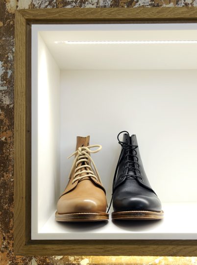 Une "boite à chaussures" file le long de la pièce et forme un écrin pour les différents modèles. Toute en sobriété, elle associe bois et corian, liés par un joint creux.