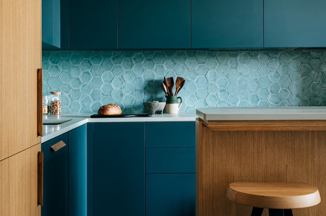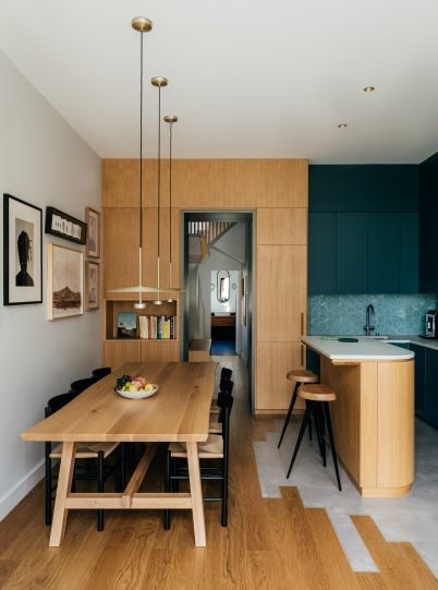La cuisine est ouverte sur la pièce à vivre, le sol en béton marque une transition progressive. Derrière l'ensemble en placage bois, qui masque le réfrigérateur et des rangements, l'espace d'entrée débouche également sur la salle de bain des invités.