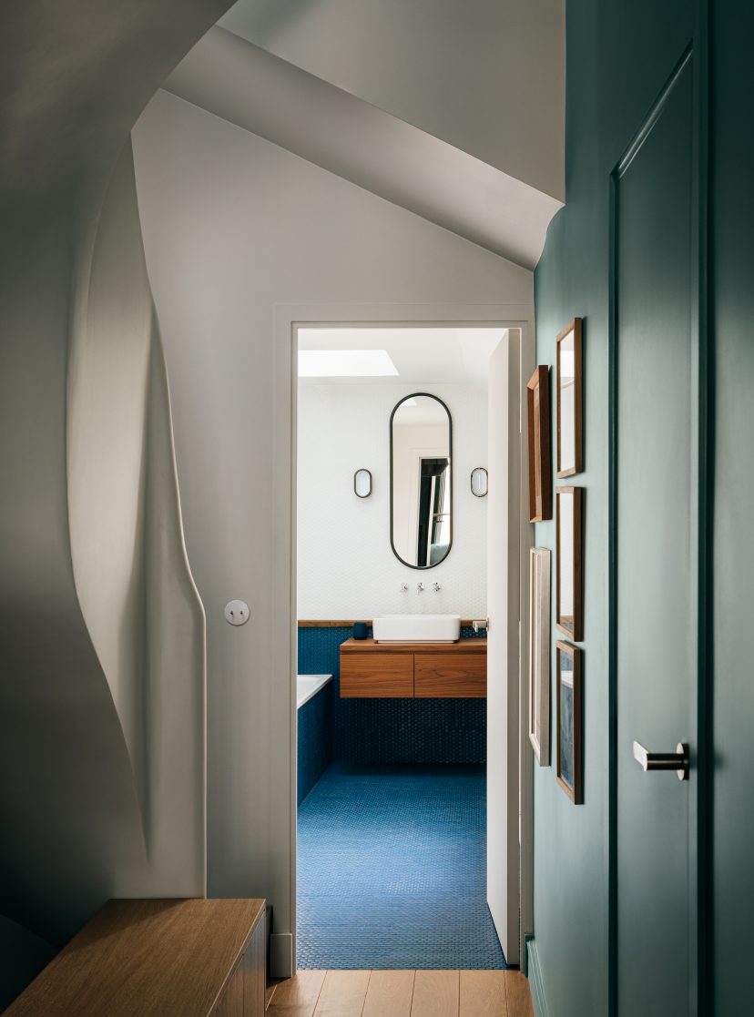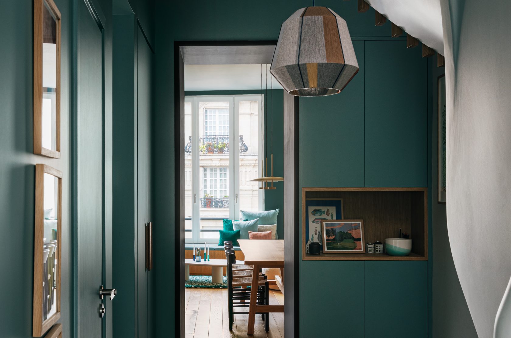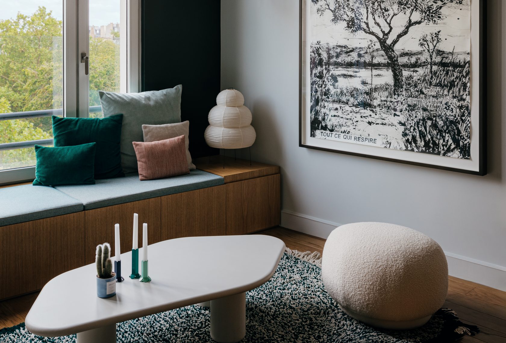 Devant la fenêtre, une banquette filante crée un espace cocooning et abrite des rangements coulissants
