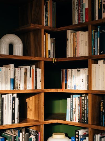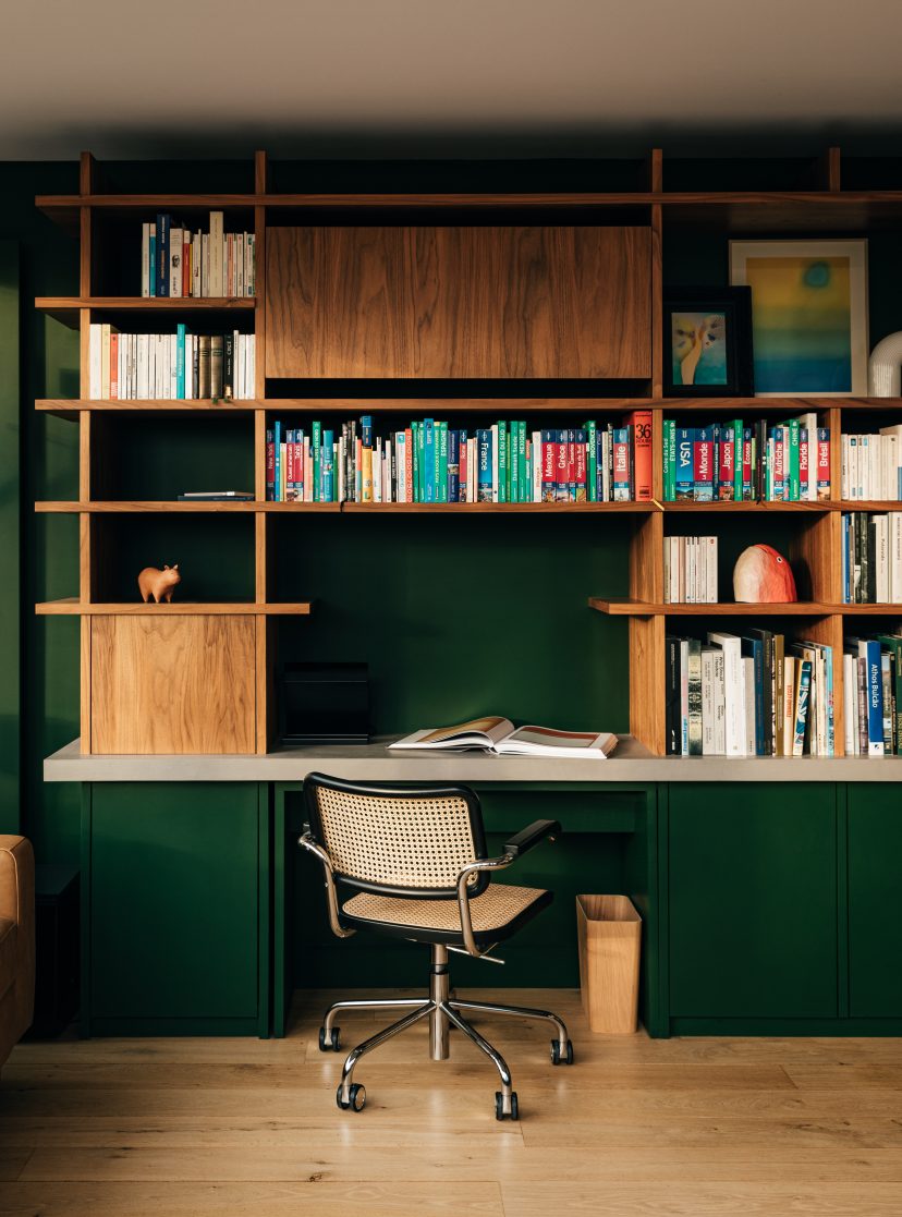 Dans la véranda, une bibliothèque sur-mesure alliant noyer et plan en béton accueille un espace bureau