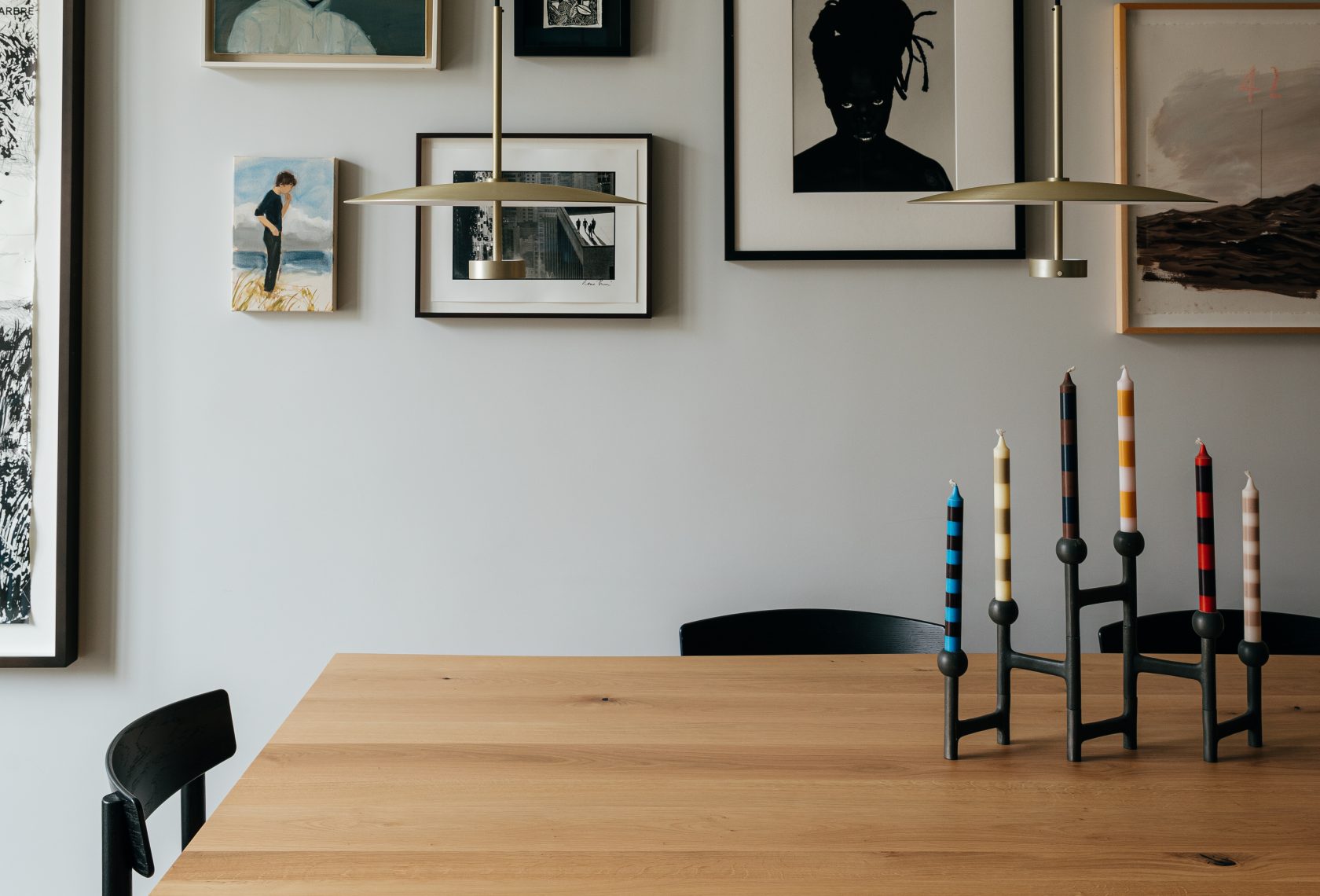 La sobriété des luminaires laisse toute leur place à la collection de peintures et de photos des propriétaires
