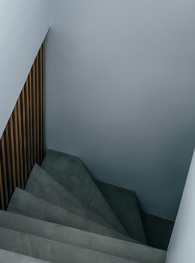 L'escalier qui mène au bureau et à la terrasse fait dialoguer le béton brut avec les courbes douces du garde-corps en staff, soulignées par la lumière naturelle qui baigne l'espace